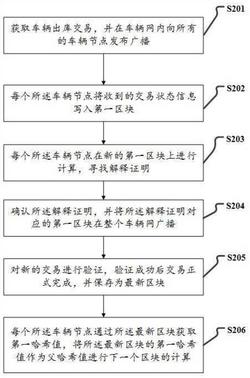 其中,每个所述车辆节点将收到的交易状态信息写入第一区块,具体包括:在所述车辆网内,所有的车辆节点进行计算将所述交易状态信息写入到第一区块的交易状态信息区,其中,所述第一区块包括块高度、头部哈希值、解释证明数据区、交易状态信息区;