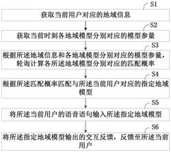 1.一种语音交互方法,其特征在于,包括:获取当前用户对应的地域信息;获取当前时刻各地域模型分别对应的模型参量;根据所述地域信息和各地域模型分别对应的模型参量,轮询计算各所述地域模型分别对应的匹配概率;根据所述匹配概率匹配与所述当前用户对应的指定地域模型;将所述当前用户的语音语句输入所述指定地域模型;将所述指定地域模型输出的交互反馈,反馈至所述当前用户。2.根据权利要求1所述的语音交互方法,其特征在于,所述获取当前时刻各地域模型分别对应的模型参量的步骤,包括:获取指定时间段内第一地域模型的多组模型参量,其中,所述第一地域模型为所有地域模型中的任一个;将多组模型参量通过似然函数求解,得到所述第一地域模型当前对应的指定模型参量;根据所述第一地域模型当前对应的指定模型参量的计算方式,计算各地域模型分别对应的模型参量。3.根据权利要求1所述的语音交互方法,其特征在于,所述根据所述地域信息和各地域模型分别对应的模型参量,轮询计算各所述地域模型分别对应的匹配概率的步骤,包括:将所述第一模型当前对应的指定模型参量和所述地域信息,输入第一计算公式,其中,所述第一计算公式为w和b表示所述指定模型参量,X表示所述地域信息,