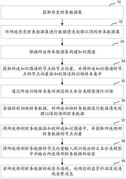 1.一种财务数据违规检测方法,其特征在于,包括:获取历史财务数据集,所述历史财务数据集包括多个标注了标签的财务数据,所述标签包括违规以及合规;对所述历史财务数据集进行数据清洗处理以得到样本数据集,所述样本数据集包括多个样本数据,所述样本数据由财务数据经过数据清洗处理后得到;根据所述样本数据集构建知识图谱,其中,所述知识图谱的节点为样本数据;获取所述知识图谱的节点的节点向量,并将所述知识图谱的节点的节点向量添加到预设的训练样本集中;通过所述训练样本集对预设的文本分类模型进行训练;若接收到初始财务数据,对所述初始财务数据进行数据清洗处理以得到待测财务数据;将所述待测财务数据添加到所述知识图谱中,并获取所述待测财务数据的节点向量;将所述待测财务数据的节点向量输入到训练后的文本分类模型中并输出所述待测财务数据的标签;若所述待测财务数据的标签为违规,向预设的监管终端发送违规告警消息。2.根据权利要求1所述的财务数据违规检测方法,其特征在于,所述根据所述样本数据集构建知识图谱,包括:将所述样本数据集中的样本数据作为知识图谱的节点添加到知识图谱的节点集合中;分别获取所述节点集合中任意两个节点之间的余弦距离;判断所述节点集合中的两个节点之间的余弦距离是否大于预设的余弦距离阈值;若所述节点集合中的两个节点之间的余弦距离大于预设的余弦距离阈值,在该两节点之间建立边,并将该两节点之间的边添加到知识图谱的边集合中。3.根据权利要求2所述的财务数据违规检测方法,其特征在于,所述获取所述知识图谱的节点的节点向量,包括:从所述知识图谱的节点出发,根据该节点与其它节点之间的边进行随机游走,得到预设长度的节点序列;对所述节点的节点序列进行分词处理以得到第一分词集合;对所述第一分词集合的词语进行词向量训练以得到所述第一分词集合的词语的词向量;将所述第一分词集合的词语的词向量输入到预设的双向GRU网络中,以由所述双向GRU网络输出所述节点的节点向量。4.根据权利要求3所述的财务数据违规检测方法,其特征在于,所述对所述节点的节点序列进行分词处理以得到第一分词集合,包括:通过预设分词工具将所述节点的节点序列划分为多个词语以得到第一初始分词集合;将所述第一初始分词集合中的停止词删除以得到所述第一分词集合。5.根据权利要求1所述的财务数据违规检测方法,其特征在于,所述通过所述训练样本集对预设的文本分类模型进行训练,包括:将训练样本集中的节点向量输入到所述文本分类模型中,并根据预设的反向传播算法对所述文本分类模型进行训练。
