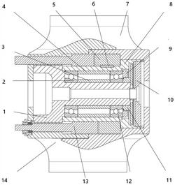 关节上轴套与转轴主轴通过螺纹连接;移动爪盘小端与关节上轴套通孔配合;所述的移动爪盘组件由移动爪盘、主动杆和从动杆组成;所述移动爪盘的一端固定有间距设置的主动杆和从动杆,另一端设有牙嵌;主动杆和从动杆与关节上轴套开设的两个滑道分别构成滑动副;锁止卡槽的中心孔套置在主动杆外,锁止卡槽外侧壁固定在关节上轴套开设的滑道外端位置;锁止卡槽开设有的中心孔孔壁开设有间距设置的两个环形槽;两个环形槽的侧壁开设有沿周向呈180度布置的两个连通槽,两个连通槽均连通两个环形槽;锁止卡扣套置在锁止卡槽的中心孔内,锁止卡扣上一体成型且沿周向呈180度布置的两个锁止块均嵌入锁止卡槽上靠近外端的环形槽内;弹簧置于锁止卡扣内端面开设的槽口内,弹簧的两端分别与锁止卡扣的槽口底面和主动杆的轴肩接触;