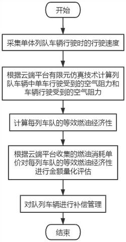 1.一种基于空气动力学优化的队列车辆的行驶管理方法,其特征在于:包括,通过车辆速度传感器采集单体列队车辆行驶时的行驶速度v;根据云端平台有限元仿真技术计算所述列队车辆中单车行驶受到的空气阻力C和车辆xi行驶受到的空气阻力Ci;根据所述空气阻力Ci与空气阻力C计算每列车队的等效燃油经济性Ji(C,Ci);根据云端平台收集的燃油消耗单价对所述每列车队的等效燃油经济性Ji(C,Ci)进行金额量化评估,根据所述量化的金额值对队列车辆进行补偿,进而完成队列车辆的行驶管理;所述等效燃油经济性Ji(C,Ci)包括,Ji(C,Ci)=Ci‑C其中,i为队列行驶车辆中的第i辆车。2.如权利要求1所述的基于空气动力学优化的队列车辆的行驶管理方法,其特征在于:所述金额量化评估包括,计算拟向每辆队列车辆收取的费用值Si,并根据所述费用值Si计算拟向队列车辆整体收取的费用值S;根据所述费用值S和空气阻力Ci计算拟向处于队列车辆中每辆车再分配的金额值Ai;根据所述金额值Ai和费用值Si计算金额值Wi。3.如权利要求2所述的基于空气动力学优化的队列车辆的行驶管理方法,其特征在于:所述费用值Si包括,Si=Ji×a其中,a为所述燃油消耗单价。4.如权利要求2或3所述的基于空气动力学优化的队列车辆的行驶管理方法,其特征在于:所述费用值S包括,所述拟向队列车辆整体收取的费用值S是向每辆队列车辆拟收取的费用值的总和:其中,n为队列车辆中车辆总数。5.如权利要求4所述的基于空气动力学优化的队列车辆的行驶管理方法,其特征在于:所述金额值Ai包括,