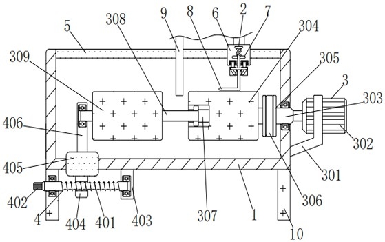 所述螺纹杆(401)的外壁与底座(10)的内壁螺纹连接,所述螺纹杆(401)的左侧与握把(402)的右侧相固接,所述螺纹杆(401)的右侧与宽板(403)的左侧转动相连,所述宽板(403)的顶部与支架(1)的底部左侧相固接,所述螺纹杆(401)的外壁与套板(404)的内壁螺纹连接,所述套板(404)的顶部与方板(405)的底部相固接,所述方板(405)的内壁与支架(1)的底部左侧间隙配合,所述方板(405)的顶部与长板(406)的底部相固接,所述长板(406)的右侧上方与凸杆(308)的左侧转动相连。