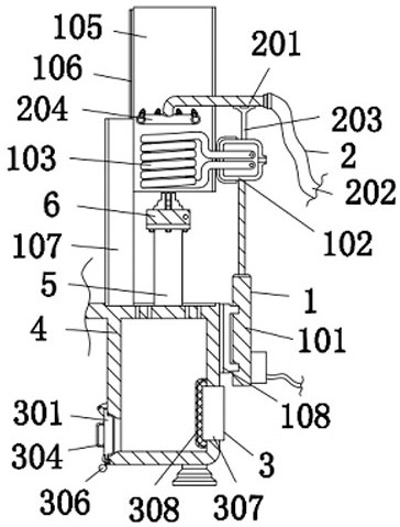 1.一种立式三维数控淬火机床,包括机床(4),其特征在于:所述机床(4)的顶部固定连接有基座(5),所述基座(5)的顶部固定连接有三爪卡盘(6),所述机床(4)的内部右侧开设有空腔(7),所述空腔(7)的顶部等距开设有竖孔(8),所述机床(4)的上方设有加热组件(1);所述加热组件(1)包括伸缩电机(101)、壳体(102)、加热圈(103)、陶瓷板(104)、第一半圆板(105)、滑轨(106)、第二半圆板(107)和第一支座(108);所述伸缩电机(101)的左侧通过第一支座(108)与机床(4)的右侧固定连接在一起,所述伸缩电机(101)的输出端与壳体(102)的外壁底部固定连接在一起,所述壳体(102)的左侧设有加热圈(103),所述加热圈(103)的右端贯穿壳体(102)的外壁左侧并延伸至壳体(102)的内部,所述加热圈(103)与壳体(102)固定连接在一起,所述壳体(102)的外壁左侧与陶瓷板(104)的右侧固定连接在一起,所述加热圈(103)的外壁固定连接有第一半圆板(105),所述第一半圆板(105)的左侧设有第二半圆板(107),所述第一半圆板(105)的左侧与第二半圆板(107)的右侧相贴合,且第一半圆板(105)通过滑轨(106)与第二半圆板(107)滑动卡接在一起,所述第二半圆板(107)的底部与机床(4)的顶部固定连接在一起。2.根据权利要求1所述的一种立式三维数控淬火机床,其特征在于:所述竖孔(8)的内径为五毫米。3.根据权利要求1所述的一种立式三维数控淬火机床,其特征在于:所述壳体(102)的上方设有冷却组件(2);所述冷却组件(2)包括曲管(201)、软管(202)、第二支座(203)、环形管(204)和喷头(205);所述曲管(201)的顶部右侧固定连接有第二支座(203),所述第二支座(203)的底部与壳体(102)的顶部固定连接在一起,所述曲管(201)的右端连通有软管(202),所述曲管(201)的左端底部与环形管(204)的右侧相连通,所述环形管(204)的顶部呈四十五度环形连通有喷头(205)。4.根据权利要求3所述的一种立式三维数控淬火机床,其特征在于:所述喷头(205)与竖直方向所呈锐角为四十五度。5.根据权利要求1所述的一种立式三维数控淬火机床,其特征在于:所述空腔(7)的内部设有收集机构(3);所述收集机构(3)包括盖体(301)、第一支架(302)、第二支架(303)、第一把手(304)、挂钩(305)、第二把手(306)、风机(307)和网罩(308);所述盖体(301)的左侧顶部固定连接有第一支架(302),所述第一支架(302)的顶部通过销轴与第二支架(303)的底部转动相连,所述第二支架(303)的末端与机床(4)固定连接在一起,所述盖体(301)的右侧与机床(4)相贴合,所述盖体(301)的左侧下方与挂钩(305)卡接在一起,所述挂钩(305)的外壁右侧通过轴承与机床(4)转动相连,所述挂钩(305)的底部固定连接有第二把手(306),所述盖体(301)的左侧固定连接有第一把手(304),所述风机(307)位于空腔(7)的内部并贯穿空腔(7)的右侧,所述风机(307)的左侧设有网罩(308),所述网罩(308)的右侧与空腔(7)的内壁右侧固定连接在一起。6.根据权利要求5所述的一种立式三维数控淬火机床,其特征在于:所述盖体(301)与机床(4)贴合处夹合有橡胶圈。