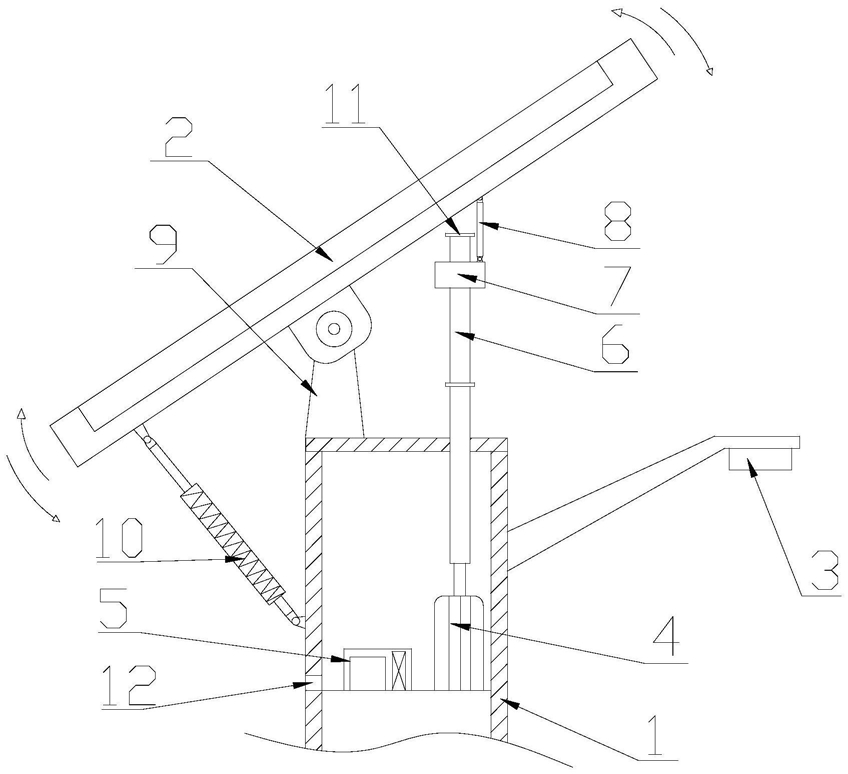 1.一种可调式太阳能路灯,包括中空结构的立柱(1)、设置在立柱(1)顶端的太阳能电池板(2)和设置在立柱(1)一侧的照明灯体(3),其特征在于:所述立柱(1)内上端的基座上安装有电机(4),所述电机(4)的一侧设有储控一体锂电池(5),所述电机(4)的输出端固接有穿过所述立柱(1)顶部的螺杆(6),所述螺杆(6)上套设有螺母(7),所述螺母(7)的一侧铰接有推拉杆(8),所述太阳能电池板(2)背部与设置在所述立柱(1)顶部的支撑座(9)相互铰接,所述推拉杆(8)的顶端与所述太阳能电池板(2)背部的上端铰接,所述太阳能电池板(2)背部的下端铰接拉伸弹簧(10)的一端,所述拉伸弹簧(10)的另一端铰接在所述立柱(1)的侧壁上。