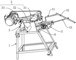 5.根据权利要求2所述的一种摇摆式仿形铣,其特征在于:所述倒U型框架(51)右端中间位置固定第一连板,所述第一连板设有第三转杆(43)下端且第一连板与第三转杆(43)通过竖直布置的第一转轴连接,所述第三转杆(43)与第二转杆(42)通过竖直的第二转轴连接,所述第二转杆(42)与第一转杆(41)通过竖直的第三转轴连接,所述第一转杆(41)远离第二转杆(42)的一端开设U形槽,所述机架(1)上端与第一转杆(41)连接的位置固定支撑圆柱,所述支撑圆柱设在U形槽内部。