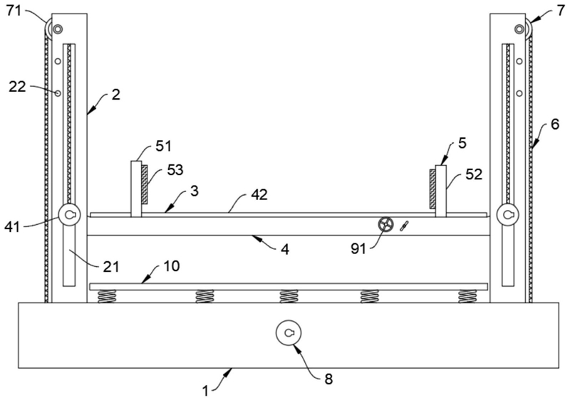 1.一种建筑装饰板安装升降机,包括底座(1),其特征在于,所述底座(1)对称设有多组立柱(2),所述立柱(2)滑动连接有升降装置(3),所述升降装置(3)包括升降台(4)和夹紧机构(5),所述升降台(4)的两端均通过转动轴(41)和立柱(2)滑动连接,所述转动轴(41)固定连接有钢缆(6),所述钢缆(6)通过滑轮组(7)固定连接有卷线器(8),所述夹紧机构(5)包括固定件(51)和移动件(52),所述固定件(51)和升降台(4)固定连接,所述移动件(52)通过调节机构(9)和升降台(4)滑动连接,所述底座(1)设有弹簧板(10)。