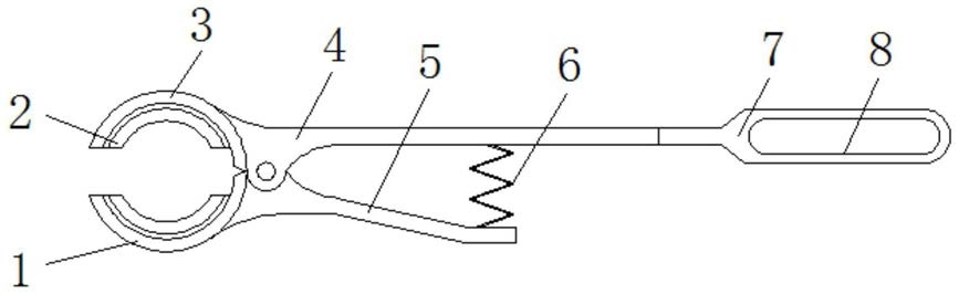 1.细胞破碎样品夹持钳,包括主钳臂(4)和副钳臂(5),所述主钳臂(4)和副钳臂(5)之间相互铰接,且副钳臂(5)的端部和主钳臂(4)之间固定安装有弹簧(6),其特征在于,所述主钳臂(4)的一端设置有弧形结构的主钳头(3),所述副钳臂(5)的一端设置有弧形结构的副钳头(1),所述主钳头(3)和副钳头(1)的内弧面均固定安装有夹持件(2),所述主钳臂(4)的另一端设置有把手部(7)。