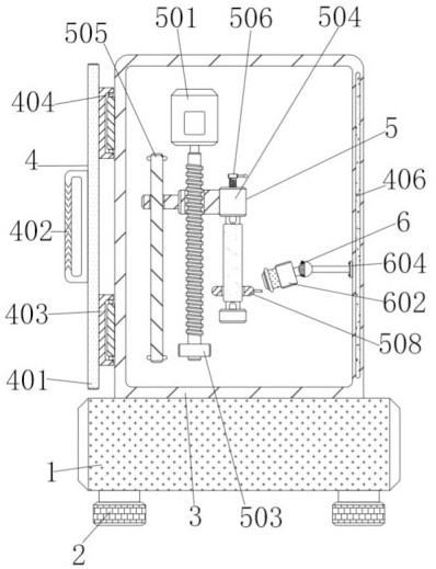 所述电机(501)的后端固接在壳体(3)的左侧上方,所述电机(501)的输出轴固接有丝杆(502),所述丝杆(502)通过转块(503)与壳体(3)转动相连,所述丝杆(502)的上方外壁与夹板(504)的左侧内壁螺纹相连,所述夹板(504)的左侧内壁与竖杆(505)的上方外壁间隙配合,所述竖杆(505)的后端固接在壳体(3)的左侧内部前端,所述夹板(504)的右侧上方内壁与顶杆(506)的中间外壁螺纹相连,所述顶杆(506)底端与工件(507)的顶端中间相贴合,所述工件(507)的底端中间与夹板(504)的右侧下方顶端相贴合,所述工件(507)的下方外壁与涡流感应圈(508)的中间内壁间隙配合,所述涡流感应圈(508)通过导线与外接电源电性相连,所述涡流感应圈(508)的后端固接在壳体(3)的中间下方。