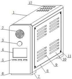 1.一种具有智能语音识别功能的UPS电源,包括电源主体(1)和前盖(6),其特征在于:所述前盖(6)安装在电源主体(1)的前端外壁上,所述前盖(6)前端外壁内部设置有语音识别窗口(2),所述语音识别窗口(2)下侧的前盖(6)上设置有开关键(3),所述开关键(3)下侧的前盖(6)上设置有触摸屏(4),所述触摸屏(4)下侧的前盖(6)上设置有操作按钮(5),所述电源主体(1)下端外壁上设置有底座(7),所述电源主体(1)右侧外壁上设置有侧板固定口(8),所述侧板固定口(8)周长内部设置有可拆式侧板(10),所述电源主体(1)和可拆式侧板(10)通过螺丝(11)固定连接,所述可拆式侧板(10)右端外壁内部设置有散热槽(9),所述电源主体(1)上端外壁内部设置有散热孔(12),所述电源主体(1)周长内部设置有电池柜(13),所述电源主体(1)后端外壁上设置有活动插口装置(14),所述活动插口装置(14)上设置有安装槽(17),所述安装槽(17)周长内部设置有插板(16),所述插板(16)前端外壁内部设置有插孔(23),所述安装槽(17)左右两端内壁内部分别设置有左侧轴孔(20)、右侧轴孔(28),所述左侧轴孔(20)左端内壁内部设置有旋转槽(18),所述旋转槽(18)圆周内部套接有旋转块(19),所述旋转块(19)右端外壁上设置有左侧转轴(21),所述左侧转轴(21)最右端穿过左侧轴孔(20)并设置在插板(16)的周长内部,所述右侧轴孔(28)的内部设置有右侧转轴(29),所述右侧转轴(29)圆周内部设置有电线连接孔(25),所述电线连接孔(25)右侧的旋转槽(18)右端内壁内部设置有电线进口(24),所述插板(16)上端外壁上设置有铁质块(15),所述安装槽(17)上端内壁内部设置有上挡槽(26),所述铁质块(15)最上端设置在上挡槽(26)的周长内部,所述上挡槽(26)下侧的安装槽(17)上设置有下挡槽(22)。2.根据权利要求1所述的一种具有智能语音识别功能的UPS电源,其特征在于:所述上挡槽(26)和下挡槽(22)的周长内部分别设置有磁质块(27),所述磁质块(27)的宽度小于插板(16)的宽度。3.根据权利要求1所述的一种具有智能语音识别功能的UPS电源,其特征在于:所述电源主体(1)截面面积大于侧板固定口(8)的截面面积,所述侧板固定口(8)的截面面积大于可拆式侧板(10)。4.根据权利要求1所述的一种具有智能语音识别功能的UPS电源,其特征在于:所述安装槽(17)的长度和宽度相同,所述插板(16)的截面面积小于安装槽(17)的截面面积。5.根据权利要求1所述的一种具有智能语音识别功能的UPS电源,其特征在于:所述旋转块(19)的直径大于左侧转轴(21)的直径,所述左侧转轴(21)的直径大于电线连接孔(25)的直径。6.根据权利要求2所述的一种具有智能语音识别功能的UPS电源,其特征在于:所述上挡槽(26)和下挡槽(22)的大小形状均相同,所述上挡槽(26),所述磁质块(27)和上挡槽(26)的截面形状大小均相同。