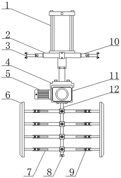 1.一种新型的锅炉烟气除尘装置,包括液压伸缩缸(1)和安装底座(2),其特征在于:所述液压伸缩缸(1)安装固定在安装底座(2)的上端中间位置上,所述安装底座(2)的两端中间设置有固定套筒(10),所述固定套筒(10)的内部中间设置有外侧固定杆(3),所述液压伸缩缸(1)的下端设置有凹型固定块(4),所述凹型固定块(4)的下端内侧设置有减速机(11),所述减速机(11)的左端设置有驱动电机(5),所述减速机(11)的下端设置有转动轴杆(12),所述转动轴杆(12)的外侧套接设置有调节固定杆(7),所述调节固定杆(7)的下方位于转动轴杆(12)上设置有阻挡套块(8),所述调节固定杆(7)的外侧设置有烟尘刮刀(6),所述调节固定杆(7)和烟尘刮刀(6)通过固定螺钉(9)固定连接,所述驱动电机(5)与外部电源电性连接。