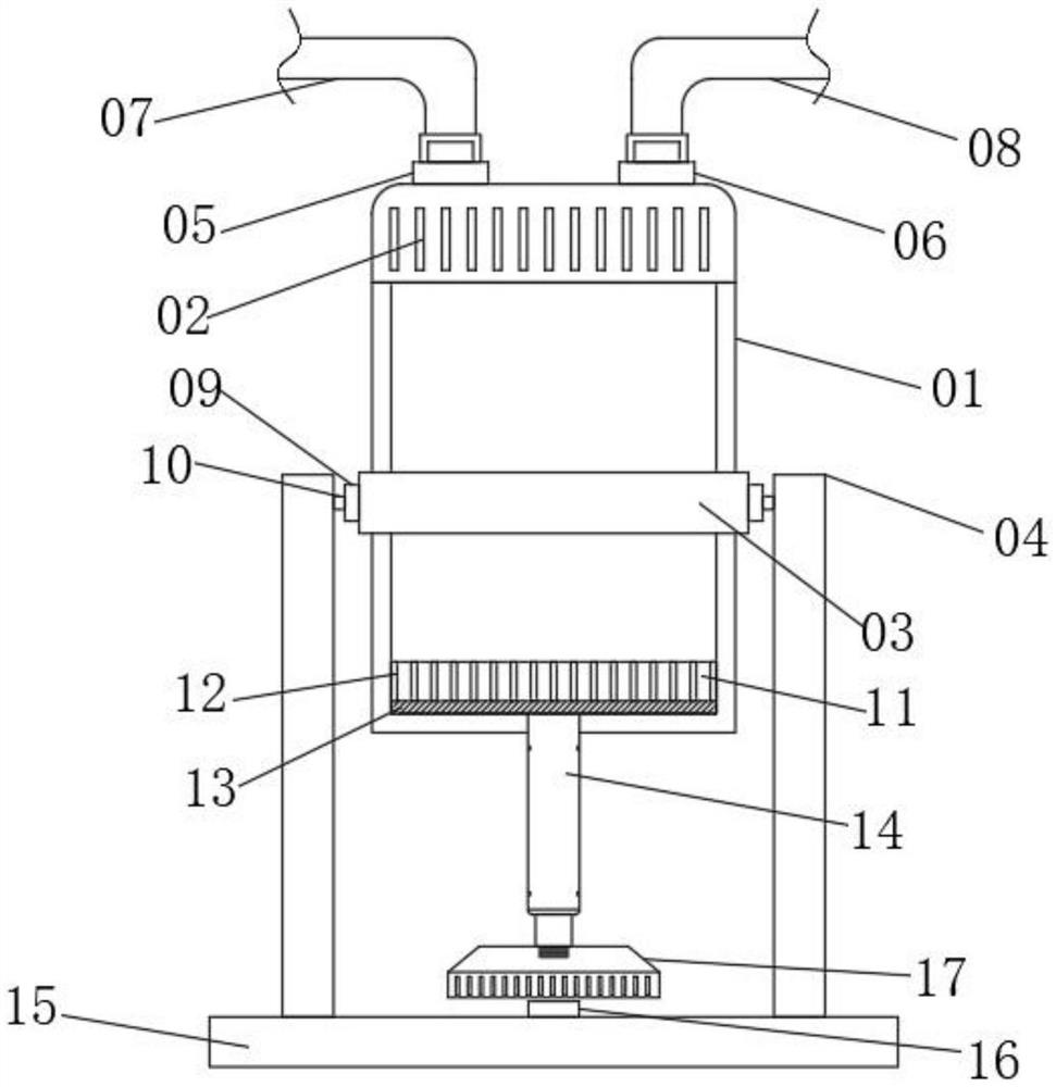 3.根据权利要求2所述的一种便于清洗的呼吸科吸痰装置,其特征在于:两根所述固定杆(04)的底部均固定连接有固定底板(15),所述固定底板(15)顶部的中央位置固定连接有固定插块(16),所述固定插块(16)的俯视图形为圆形。
