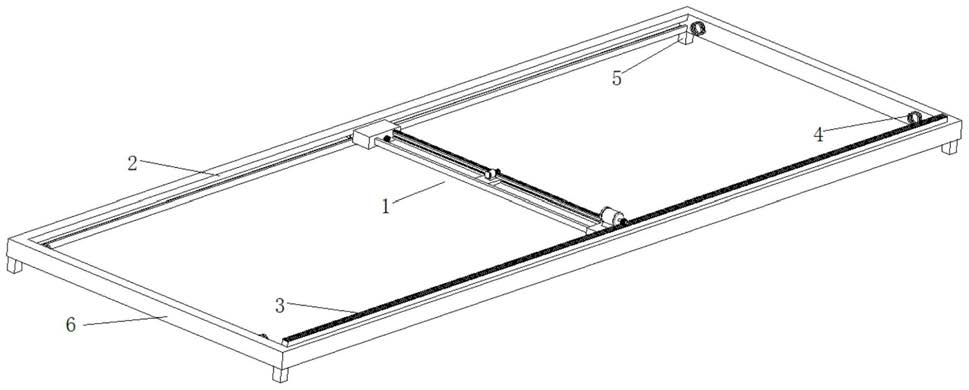 1.一种利用商船横摇和纵摇的发电装置,其特征在于:该装置包括横摇滑块组(1)、横摇导轨(2)、横摇齿条(3)、横摇减震弹簧(4)、可调节支座(5)、横梁(6),其中,所述横摇滑块组(1)包括:横摇滑块(101)、横摇轮子(102)、横摇发电机(103)、横摇发电机齿轮(104)、纵摇导轨(105)、纵摇滑块(106)、纵摇轮子(107)、纵摇齿条(108)、纵摇发电机(109)、纵摇发电机齿轮(110)、纵摇减震弹簧(111)。