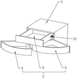 3.根据权利要求1所述的指纹识别文件柜,其特征在于:所述次抽屉(4)包括底板(41)、设于所述底板(41)上的第一直板(42)、第二直板(43)及弧形板(44),所述第一直板(42)与所述第二直板(43)相互垂直且一端连接,另一端之间连接所述弧形板(44),所述底板(41)、所述第一直板(42)、所述第二直板(43)、所述弧形板(44)围合形成容置空间,所述第一直板(42)与所述第二直板(43)的连接位置与所述旋转轴(5)铰接。