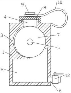 1.一种新型肿瘤科用护理配药器,包括杯体(1)、混合腔(2)、碾碎腔(3)、进料口(4)、进料密封结构、动力轴(5)、出药口(6)、碾碎辊(7),其特征在于,所述混合腔(2)开于杯体(1)底部,所述碾碎腔(3)开于混合腔(2)上部,所述碾碎辊(7)可转动安装于碾碎腔(3)内,所述碾碎腔(3)为近似于圆形的腔体结构,所述碾碎腔(3)左侧自上而下距离碾碎辊(7)距离逐渐接近,所述碾碎腔(3)右侧与碾碎辊(7)滑动相抵,所述进料口(4)安装于杯体(1)上端碾碎腔(3)上方,所述进料密封结构安装于进料口(4)及杯体(1)上,所述动力轴(5)安装于碾碎辊(7)轴心上且从杯体(1)伸出,所述出药口(6)安装于杯体(1)下部且与混合腔(2)连通。