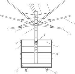 1.一种家居生活用晾衣装置,包括放置箱(11),其特征在于:所述放置箱(11)的顶部固定连接有衣架台面(13),所述放置箱(11)的内腔开设有滑槽,所述放置箱(11)内部的中活动套装有衣架伸缩总杆(8),所述衣架伸缩总杆(8)的底部固定连接有二号卡杆(9),且衣架伸缩总杆(8)的中部固定连接有一号卡杆(1),所述一号卡杆(1)和二号卡杆(9)的内部分别开设有凹槽,且凹槽的内部固定连接有弹簧(10),所述弹簧(10)的一端固定连接有弹簧按钮固件(2),所述一号卡杆(1)的外部通过轴承固定套装有均匀分布且相互对此的伸缩底杆(3),所述一号卡杆(1)每侧伸缩底杆(3)的数量为三个,且三个伸缩底杆(3)的内部从上至下分别卡接有第三伸缩子杆、第二伸缩子杆和第一伸缩子杆,六个所述伸缩底杆(3)固定连接有靠近衣架伸缩总杆(8)一侧的牵引链条(7),所述衣架伸缩总杆(8)的内部固定连接有固定杆(14),所述固定杆(14)的外部与牵引链条(7)的一端相连接。2.根据权利要求1所述的一种家居生活用晾衣装置,其特征在于:所述放置箱(11)的底部固定安装有轮子(12),且放置箱(11)的内腔的底部固定安装有负重块(16),所述放置箱(11)的内腔固定连接有置物面板(18),所述放置箱(11)上滑槽的内部开设有均匀分布的通孔,且通孔的内部与弹簧按钮固件(2)的外部相卡接。3.根据权利要求1所述的一种家居生活用晾衣装置,其特征在于:所述衣架伸缩总杆(8)的顶部固定连接有提拉把手(19),所述衣架伸缩总杆(8)的形状为n字形,所述衣架伸缩总杆(8)的内部开设有与弹簧按钮固件(2)相适配且均匀分布的卡槽(17)。4.根据权利要求1所述的一种家居生活用晾衣装置,其特征在于:所述放置箱(11)的内部活动套装有抽屉(15),所述第三伸缩子杆、第二伸缩子杆和第一伸缩子杆的长度不相同。