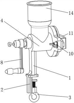 1.一种适用于居家使用的谷物磨具,包括机座(1),其特征在于:所述机座(1)底面设置有夹桌台(2),所述夹桌台(2)下部螺纹连接有固定器(3),所述机座(1)中部设置有推送通道(4),所述推送通道(4)背面中心固定连接有内磨盘(5),所述推送通道(4)内部转动连接有绞龙(6),所述绞龙(6)正面螺纹连接有尾块(7),所述绞龙(6)前端套接有转手(8),所述转手(8)把手处套接有木柄(9),所述推送通道(4)背面两侧均套接有连接模块(10),所述连接模块(10)之间活动连接有卡紧块(11),所述机座(1)上部与所述推送通道(4)之间固定连接有送料管(12),所述送料管(12)上部套接有料斗(13)。