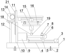 1.一种全尺寸回转支承热处理设备,包括底座(1)、第一驱动电机(3)、导轨(10)和支撑立板(12),其特征在于:所述底座(1)顶部一端通过安装槽安装有支撑立板(12),所述底座(1)顶部另一端通过安装座安装有第一驱动电机(3),所述底座(1)顶部通过螺丝安装有滑轨(4),所述滑轨(4)和支撑立板(12)之间焊接有导轨(10),所述支撑立板(12)顶部焊接有固定板且固定板顶部通过螺栓安装有步进电机(13),所述步进电机(13)的动力输出端连接有主动齿轮(14),所述导轨(10)内套设有导杆(11)且导杆(11)一端焊接有与主动齿轮(14)啮合的齿条(21),所述导杆(11)另一端通过螺栓安装有XY位移平台(15),所述XY位移平台(15)的位移端为位移板(16),所述位移板(16)底部通过螺钉安装有第二驱动电机(17),所述第二驱动电机(17)的动力输出端连接有套管(18),所述套管(18)一端通过螺纹槽安装有紧固螺钉(19),所述滑轨(4)内套设有丝块(5),所述第一驱动电机(3)的动力输出端连接有丝杆且丝杆贯穿丝块(5),所述丝块(5)顶部焊接有U型块(6),所述导轨(10)一端通过螺栓固定有电热炉(9)。