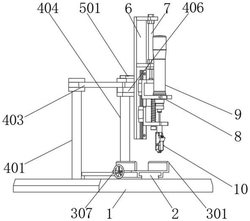 4.根据权利要求2所述的一种拖拽式自动螺丝机,其特征在于:所述转把(307)、所述螺纹杆(308)和所述限位环(309)之间为一体式结构,所述限位环(309)设置有两组,两组所述限位环(309)之间的最短距离和所述凸块(305)的宽度相同,所述限位环(309)的截面尺寸大于所述通孔(306)的截面尺寸,所述螺纹杆(308)通过所述通孔(306)和所述凸块(305)之间构成旋转结构。
