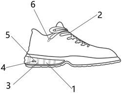 1.一种户外骑行充气鞋,包括鞋面、鞋底和鞋带,其特征在于:所述鞋底的后跟处设有气囊,所述气囊内设有多个弹性立柱,多个弹性立柱的弹性从鞋底中部到鞋底后端逐渐减弱,所述气囊的外侧上设有与气囊连通的单向进气阀和出气接头,所述出气接头上设有出气孔盖子,所述鞋带为中空结构,其两端分别设有鞋带头,两个鞋带头分别与出气接头、车胎气门芯连接,每个鞋带头上均设有一个鞋带头盖子。
