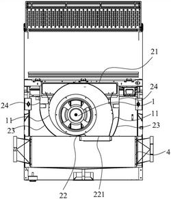 4.根据权利要求3所述的导流效果优良的集成灶风箱结构,其特征在于:所述风机蜗壳组件(1)以出风端端口朝下的姿态安装在风箱壳体中,左右两侧板下半部分的弧形导流板(23)分别与其邻近的风机蜗壳组件(1)的弧形蜗壳(11)之间形成弧形风道。