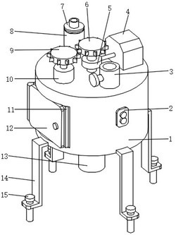 1.一种镁碳砖泥料冷却设备,包括冷却罐(1),其特征在于:所述冷却罐(1)上设有支撑组件,所述冷却罐(1)的周面上设有维护组件,所述冷却罐(1)的底部设有出料通道(13),所述冷却罐(1)的上端面设有进料通道(3),所述进料通道(3)和所述出料通道(13)上均安装有控制阀(16),所述冷却罐(1)上转动连接有传动杆(19),所述传动杆(19)上且位于冷却罐(1)内腔的位置处均匀设有多个搅拌杆(18),所述搅拌杆(18)的底部设有多个气孔(17),所述传动杆(19)和搅拌杆(18)均为空心结构,所述传动杆(19)的顶部设有从动轮(6),所述从动轮(6)啮合连接有主动轮(9),所述主动轮(9)连接有位于冷却罐(1)上的驱动电机(10),所述传动杆(19)上连接有旋转接头(5),所述旋转接头(5)通过气管连接有位于冷却罐(1)上的冷风机(4),所述冷却罐(1)的顶部设有过滤组件。