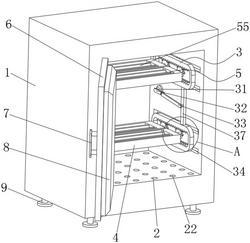 所述消毒组件(2)包括开设于消毒箱主体(1)底端内部的安装槽(21),所述安装槽(21)的顶端槽面一侧分布开设有出气孔(22),所述安装槽(21)位于出气孔(22)下方的内部安装有挡板(25),所述挡板(25)的底端板面一侧焊接固定有连接块(26),所述安装槽(21)的一侧槽面内部对称镶嵌安装有第一电机(23),所述安装槽(21)的一侧槽面内部转动连接有第一螺杆(24),且第一电机(23)的输出轴一端焊接于第一螺杆(24)的一端端面,所述连接块(26)的一侧内部对应第一螺杆(24)开设有第一螺纹孔(27),所述安装槽(21)的底端槽面一侧对称安装有加热块(28)。