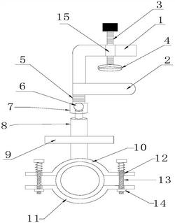 其特征在于,所述卡台(1)的一端上开设一个螺纹孔(15),螺纹孔(15)贯穿所述卡台(1),在螺纹孔(15)中螺旋配合一根螺栓一(3),螺栓一(3)位于所述倒U型的卡合部的内部一端连接一个限位垫(4);所述固定平台(2)背向卡台(1)的一侧固定连接限位座(7),所述限位座(7)内设有一个钢球(6),所述钢球(6)在限位座(7)内可以万向转动,所述钢球(6)上连接一根万向杆(8),所述万向杆(8)连接电缆固定组件;