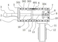 5.根据权利要求1所述的带振动优化补偿结构的筋膜枪,其特征在于:所述散热防尘机构(6)由风机(601)、防尘网(602)、卡槽(603)、支撑块(604)和卡块(605)组成,所述风机(601)设置在内壳体(2)的顶端,所述风机(601)的两侧设置有支撑块(604),所述支撑块(604)的一侧设置有卡槽(603),所述风机(601)的顶端设置有防尘网(602),所述防尘网(602)的两侧固定连接有卡块(605)。