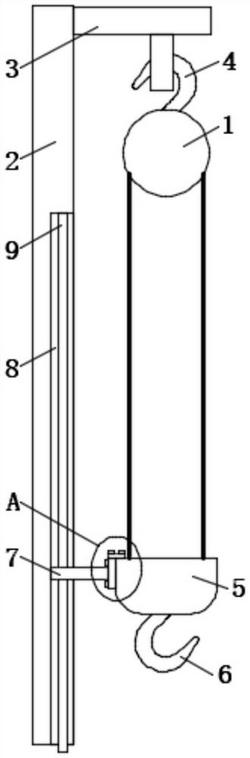 1.一种新型电动葫芦,包括电动葫芦本体(1)和固定安装在电动葫芦本体(1)一侧的固定架(2),其特征在于:所述固定架(2)顶端的外侧壁上固定安装有安装架(3),所述电动葫芦本体(1)的顶端固定安装有上挂钩(4),且上挂钩(4)挂设在安装架(3)上,所述电动葫芦本体(1)的底端固定安装有安装座(5),所述安装座(5)的底壁上固定安装有下挂钩(6),所述固定架(2)上设有与安装座(5)和下挂钩(6)相互配合的导向装置,所述导向装置包括拆卸安装在安装座(5)上的活动板(7),且活动板(7)的一端插设在固定架(2)上,所述固定架(2)上开设有与活动板(7)相互配合的活动槽(8),且活动槽(8)的底端延伸至固定架(2)的下侧,所述活动槽(8)内侧的顶壁上对称固定安装有两个与活动板(7)相互配合的导向杆(9),且两个导向杆(9)均贯穿活动板(7)设置。