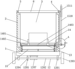 7.根据权利要求4所述的一种利用太阳能技术的货物搬运装置,其特征在于,所述连接杆(1407)的顶部一侧固定有齿条(1510),齿条(1510)滑动连接在其中一个固定板(2)的侧壁上,其中一个转动柱(5)的一端延伸至其中一个连接块(4)的外侧,并固定有齿轮三(1511),齿轮三(1511)与齿条(1510)相啮合。