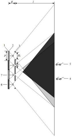 1.基于渐变孔径矩形针孔阵列的双视3D显示装置,其特征在于,包括显示屏,偏振光栅,渐变孔径矩形针孔阵列,偏振眼镜I和偏振眼镜II;显示屏,偏振光栅,渐变孔径矩形针孔阵列依次平行放置,且偏振光栅与显示屏贴合;显示屏、偏振光栅和渐变孔径矩形针孔阵列的中心对应对齐;显示屏、偏振光栅和渐变孔径矩形针孔阵列的水平宽度均相等,显示屏、偏振光栅和渐变孔径矩形针孔阵列的垂直宽度均相等;渐变孔径矩形针孔阵列水平方向上矩形针孔的数目等于垂直方向上矩形针孔的数目的两倍;在渐变孔径矩形针孔阵列中,所有矩形针孔的水平节距均相同,所有矩形针孔的垂直节距均相同,且矩形针孔的垂直节距与水平节距的比值等于渐变孔径矩形针孔阵列的垂直宽度与水平宽度的比值的两倍;