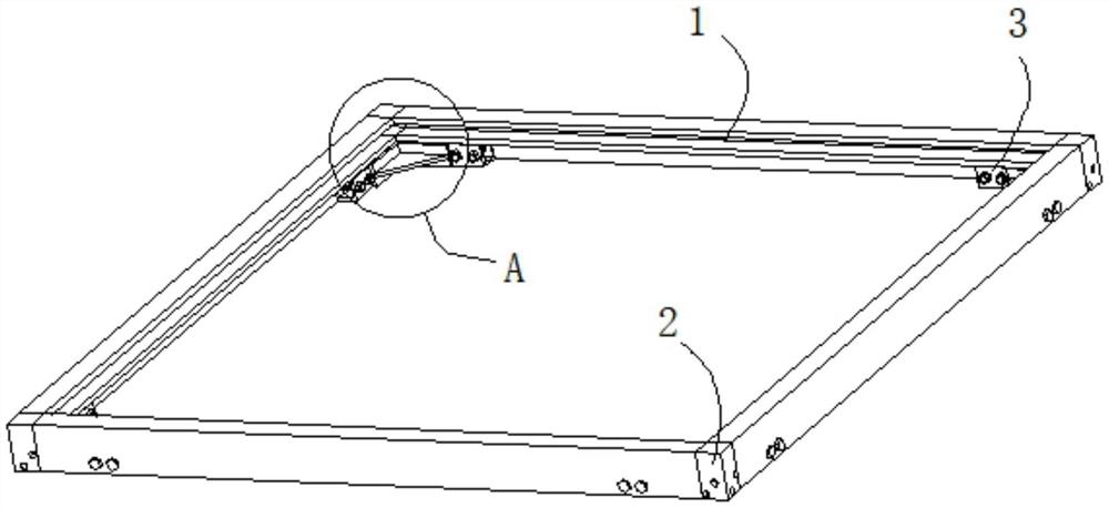 四个所述框体(1)呈矩形状分布,所述加固件(3)呈矩形状设置在四个框体(1)之间的边角处,所述加固件(3)上的方管(302)设置在第一腔体(104)内且通过紧定螺栓(4)与框体(1)一端固定连接,所述框体(1)端部与连接件(2)一侧接触。