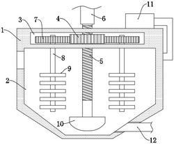 1.饲料粉碎机用锤头结构,包括机壳(1),其特征在于,所述机壳(1)的内部设有用于对饲料原料进行搅拌的搅拌腔(2),所述机壳(1)的内部于搅拌腔(2)的上方设有装置腔(3),所述装置腔(3)的内部设有用于提供搅拌动力的传动机构,所述搅拌腔(2)的内部设有与传动机构配合的用于对饲料原料进行加工的粉碎机构,所述机壳(1)的外部设有用于将机构后的饲料吹出机壳(1)的通风机构,所述传动机构包括设置于机壳(1)外部的气缸,所述气缸的输出端设有气缸输出杆(6),所述气缸输出杆(6)的下端固定连接有螺纹杆(5),所述螺纹杆(5)的下端贯穿机壳(1)的外壁以及装置腔(3)并延伸至搅拌腔(2)的内部,所述装置腔(3)的中部设有第一齿轮(4),所述第一齿轮(4)的中部与螺纹杆(5)的外缘螺纹连接,所述装置腔(3)的内部对称设有两个第二齿轮(7),两个所述第二齿轮(7)共同与第一齿轮(4)啮合,所述粉碎机构包括分别设置于两个第二齿轮(7)内部的转杆(8),两个所述转杆(8)的下端均贯穿装置腔(3)的底壁并延伸至搅拌腔(2)的内部,两个所述转杆(8)的外缘于搅拌腔(2)的内部分别固定连接有多个用于对饲料进行搅拌的搅拌杆(9),所述螺纹杆(5)的底部于搅拌腔(2)的内部固定连接有用于对饲料进行锤击的锤头(10),所述通风机构包括设置于机壳(1)上端的风机(11),所述风机(11)的出风口处通过导管与搅拌腔(2)的内部相连通。