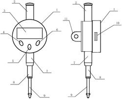 1.一种用于三维曲面补偿加工的测平器,其特征在于,包括由直径不同的第一圆柱体和第二圆柱体组成的外壳(1);所述第一圆柱体的直径大于第二圆柱体,其一面设置有显示屏(3)、一键开机键(4)、兼容模式与信号确认按键(5)和一键对码键(6),其另一面与第二圆柱体的一面连接,其侧面设置有充电接口(10);所述第二圆柱体的另一面上设置有安装耳(11),所述第二圆柱体的侧面上分别设置有第一固定柱(2)和第二固定柱(7),所述第一固定柱(2)和第二固定柱(7)的轴线均与显示屏(3)的轴线重合,所述第二固定柱(7)上还设置有可伸缩的测量轴,所述测量轴包括与第二固定柱(7)固定的外管(8)以及与外管(8)连接的内轴(9)。
