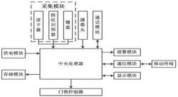 1.一种用于门禁的智能视频监控报警装置,其特征在于:由采集模块、摄像头、通话模块、中央处理器、供电模块、存储模块、门锁控制器、报警模块、通信模块、移动终端、显示模块组成;所述的采集模块包括读卡器、指纹识别器、键盘;所述的中央处理器与读卡器、指纹识别器、键盘、摄像头、通话模块、供电模块、存储模块、门锁控制器、报警模块、通信模块、显示模块相连接;所述的通信模块与移动终端相连接。