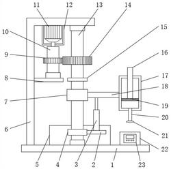 1.一种FPC柔性电路板全自动电测机,包括底座(1),其特征在于:所述底座(1)的顶部靠近左侧固定安装有L型板(6),所述L型板(6)的顶部固定安装有转动电机(11),所述转动电机(11)的底部固定安装有主动转轴(10),所述主动转轴(10)的外侧固定安装有第一齿轮(9),所述L型板(6)的右侧固定安装有安装板(8),所述主动转轴(10)与安装板(8)活动连接,所述L型板(6)的顶部活动安装有从动转轴(13),所述从动转轴(13)位于主动转轴(10)的右侧,所述从动转轴(13)的底部与底座(1)顶部活动连接,所述从动转轴(13)的外侧固定安装有第二齿轮(14),所述第一齿轮(9)与第二齿轮(14)啮合,所述从动转轴(13)的外侧活动套接有外接套(7),所述外接套(7)的右端固定连接有连接杆(18),所述连接杆(18)的右端固定安装有气箱(17),所述气箱(17)的内部活动套接有活塞(19),所述活塞(19)的顶部固定安装有气缸(16),所述气缸(16)与气箱(17)活动连接,所述气箱(17)的底部中间固定连接有吸管(20),所述吸管(20)的底部固定连接有吸盘(21),所述从动转轴(13)的外侧靠近底部固定套接有固定套(4),所述固定套(4)的右侧固定连接有强化板(2),所述强化板(2)的顶部固定连接有液压杆(3),所述液压杆(3)的顶部与连接杆(18)固定连接,所述底座(1)的顶部靠近中间的前后两侧均固定安装有放置箱(5),所述从动转轴(13)位于两个放置箱(5)中间,所述底座(1)的顶部靠近右侧固定安装有电测机(22)。