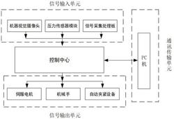 1.一种数控铣床毛坯料自动搬运、校准和固定系统,其特征在于它是由控制中心、数据输入单元、数据输出单元、通讯传输单元组成;所述的数控铣床毛坯料自动搬运、校准和固定系统的控制中心包括ARM微控制器、电源模块、监控显示屏、存储模块、视频传输接口、485通讯接口、IIC总线、以太网接口,数据输入单元包括机器视觉摄像头、压力传感器模块、信号采集处理板,数据输出单元包括伺服电机、机械手、自动夹紧设备,控制中心利用通讯传输单元分别与数据输入单元、数据输出单元和PC机进行通讯连接。