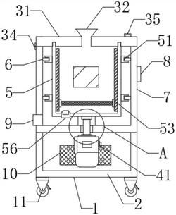 1.一种玉米淀粉生产用浸泡装置,包括主体(1),其特征在于:所述主体(1)由底座(2)、密封机构(3)、转动机构(4)、内胆(5)、限位块(6)、外壳(7)、调节开关(8)、排污口(9)、散热网(10)和万向轮(11)组成,所述密封机构(3)包括上盖板(31)、加注口(32)、定位槽(33)、铰链(34)和拉环(35),所述上盖板(31)通过铰链(34)与外壳(7)活动连接,所述加注口(32)设置在上盖板(31)中间位置,所述定位槽(33)设置在上盖板(31)下端,所述转动机构(4)包括电动机(41)、转动轴(42)、轴承(43)和保护壳(44),所述电动机(41)固定设置在底座(2)内,其前端设有转动轴(42)且通过转动轴(42)与内胆(5)连接,所述转动轴(42)与底座(2)接触部分设有轴承(43),所述内胆(5)包括转动扣(51)、定位环(52)、加热板(53)、固定端(54)、过滤网(55)和电磁阀门(56),所述转动扣(51)固定设置在内胆(5)外侧壁上,所述定位环(52)设置在内胆(5)上端一周,所述加热板(53)设置在内胆(5)内侧,其下端连接有固定端(54),所述固定端(54)内设有过滤网(55),所述电磁阀门(56)设置在内胆(5)下端一侧位置,所述转动扣(51)外侧凹槽部分对应限位块(6),所述限位块(6)固定在外壳(7)内侧,所述外壳(7)外侧设有调节开关(8),所述排污口(9)设置在外壳(7)下端电磁阀门(56)一侧。