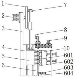 6.根据权利要求1所述的一种高效的扁头螺钉斜刀滚筒搓丝机,其特征在于:所述降温组件(6)包括喷淋管(602),喷淋管(602)的底部等距设置有雾化喷头(601),喷淋管(602)的一侧固定安装有控制阀(604),控制阀(604)的一侧固定设置有连接头(603)。
