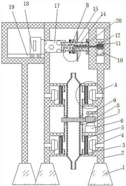 1.一种用于铜包钢生产的烘干装置,包括底座(1),其特征在于,所述底座(1)的顶端固定连接有支架(2),所述支架(2)的内壁固定安装有烘干管(3),所述烘干管(3)的内部开设有通风孔,所述烘干管(3)的顶部、底部均开设有圆形开口,所述烘干管(3)的外壁固定连接有通风筒(7),所述烘干管(3)的中部外环固定连接有第二齿轮(9),所述支架(2)的内壁固定安装有鼓风机(4),所述支架(2)的内壁固定安装有电热管(5),所述通风筒(7)的外侧与电热管(5)的内侧固定连接,所述鼓风机(4)的出风口位于电热管(5)的外侧,所述支架(2)的内壁固定安装有第一电机(6),所述第一电机(6)的输出端固定连接有第一齿轮(8),所述第一齿轮(8)与第二齿轮(9)啮合连接,所述支架(2)的顶部内壁固定安装有第二电机(10),所述第二电机(10)的输出端固定连接有转轴(11),所述转轴(11)的内部固定连接有钢丝绳(12),所述钢丝绳(12)缠绕在转轴(11)的外环,所述钢丝绳(12)的另一端转动连接有空心绳(20),所述空心绳(20)的另一端固定连接有夹具(13),所述支架(2)的顶部内壁固定安装有滑轨(19),所述滑轨(19)的上表面滑动安装有第三电机(18),所述第三电机(18)的输出端固定连接有空心转轴(17),所述空心转轴(17)的另一端活动套接有转动杆(14),所述转动杆(14)的外壁固定连接有卷线器(15),所述卷线器(15)的左侧顶部、底部外侧均固定连接有挡块(16),所述钢丝绳(12)贯穿支架(2)的侧壁,所述钢丝绳(12)贯穿转动杆(14)和卷线器(15)。