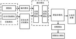 所述的摄像机与编码模块相连接;所述的语音采集模块与语音处理识别模块相连接;所述的编码模块、语音处理识别模块分别与无线发射模块相连接;所述的无线发射模块与无线接收模块相连接;所述的无线接收模块与硬盘录像机相连接;所述的硬盘录像机分别与主监控屏幕、预警模块相连接;所述的预警模块与预警指示模块相连接。