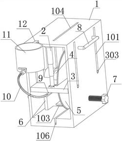 4.根据权利要求1所述的一种矿产资源勘查采样用切割装置,其特征在于,所述箱体(1)的顶部开设有用于避让刀片(5)的通槽三(104)和挂孔(105),所述挂孔(105)上挂接有底部具有球阀的水桶(11),所述水桶(11)和冷却管(9)之间连接有软管(10)。