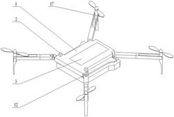 所述后腿腿架机构包括后腿前端腿架(14)、后腿末端腿架(13)、后腿桨叶收放电机(17)、后腿末端转动电机、后腿收放电机(15)、后腿升降电机和后腿移位块(16),所述后腿桨叶收放电机(17)通过螺栓固定安装在后腿末端脚架上,后腿机构的脚架机构铰接在后腿末端脚架的前端,后腿桨叶收放电机(17)的输出轴垂直于后腿末端脚架的轴线且后腿桨叶收放电机(17)的输出轴与后腿机构的脚架机构固定连接;所述后腿末端转动电机固定在后腿前端腿架(14)内部,后腿末端转动电机的输出轴平行于后腿前端腿架(14)和后腿末端脚架的轴线且后腿末端转动电机的输出轴与后腿末端脚架固定连接;所述后腿收放电机(15)竖直固定在后腿移位块(16)上,后腿收放电机(15)的输出轴与后腿前端腿架(14)固定连接;所述后腿升降电机竖直固定在机器人壳体内部,后腿升降电机上端连接后腿移位块(16),后腿升降电机上方的机器人壳体上设置有与后腿移位块(16)的截面尺寸相匹配的滑动槽,后腿升降电机工作时驱动后腿移位块(16)在滑动槽内升降从而实现后腿机构整体的升降;所述后腿移位块(16)固定在后腿收纳轨道一端的机器人外壳(1)上,后腿收放电机(15)工作时带动后腿前端腿架(14)进行转动并将整个后腿机构收纳进后腿收纳轨道内;所述后腿桨叶收放电机(17)工作时驱动后腿机构的脚架机构进行转动,所述后腿末端转动电机工作时驱动后腿末端腿架(13)和后腿机构的脚架机构组成的整体绕着后腿末端转动电机的输出轴进行转动。