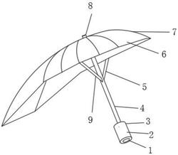 1.一种航行用自行车的伞蓬,其结构包括固定口(1)、自动固定装置(2)、连接套(3)、支撑杆(4)、右连接杆(5)、伞蓬(6)、内杆(7)、顶盖(8)、左连接杆(9),所述内杆(7)按照间隔角度相同依次排列于伞蓬(6)内侧,所述伞蓬(6)顶部与顶盖(8)底部固定连接,所述支撑杆(4)顶端连接到伞蓬(6)顶端底侧,其特征在于:所述支撑杆(4)底部与连接套(3)顶部垂直连接,所述连接套(3)内部设有固定口(1),所述自动固定装置(2)安装在连接套(3)内部,所述左连接杆(9)一端连接到支撑杆(4)顶端左侧,另一端固定于伞蓬(6)左端底侧,所述右连接杆(5)一端连接到支撑杆(4)顶端右侧,另一端固定于伞蓬(6)右端底侧;