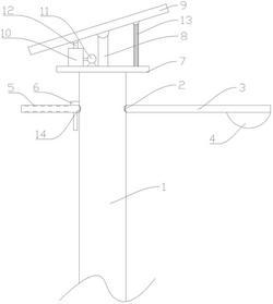 1.一种可调节式的太阳能路灯,包括灯杆(1),其特征在于:所述灯杆(1)的上侧对称开有通孔(2),所述通孔(2)内插入有支臂(3),所述支臂(3)的一端安装有照明灯体(4),所述支臂(3)的另一端纵向对称开有插槽(5),所述插槽(5)内插有限位栓(6),所述灯杆(1)的顶端固接有支撑板(7),所述支撑板(7)的中部垂直安装有支撑柱(8),所述支撑柱(8)顶端铰接有太阳能电池板(9),所述支撑板(7)上的一侧固接有气囊仓(10),所述气囊仓(10)的一侧连接安装有风机(11),所述气囊仓(10)内安装有立柱(12),所述立柱(12)的顶端铰接于所述太阳能电池板(9)的底端,所述支撑板(7)上的另一侧固接有弹性柱(13),所述弹性柱(13)的顶端铰接于所述太阳能电池板(9)的底端。