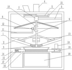 所述固定板(14)设置在所述箱体(1)内相对两侧表面,所述活动腔(15)开在所述固定板(14)侧端面,所述筛板(16)活动嵌装在所述活动腔(15)内,所述弹簧(17)连接在所述筛板(16)与所述活动腔(15)之间,所述第二电机(18)设置在所述固定板(14)上表面,所述凸块(19)连接在所述第二电机(18)输出端且位于所述活动腔(15)内。