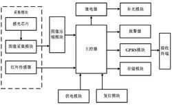 1.一种基于GPRS的远程入侵监控报警装置,其特征在于:由采集模块、图像压缩模块、主控器、供电模块、复位模块、继电器、补光模块、报警器、存储模块、GPRS模块、接收终端组成;所述的采集模块包括感光芯片、图像采集模块、红外传感器;所述的感光芯片与图像采集模块相连接;所述的图像采集模块与图像压缩模块相连接;所述的图像压缩模块、红外传感器分别与主控器相连接;所述的主控器分别与供电模块、复位模块、继电器、报警器、GPRS模块、存储模块相连接;所述的继电器与补光模块相连接;所述的GPRS模块与接收终端相连接。