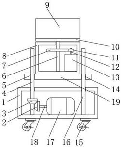 1.一种互联网平台电力系统谐波检测装置,包括底座(1),其特征在于:所述底座(1)的内底壁中部一侧转动连接有螺纹杆(4),所述底座(1)的内底壁中部另一侧固定连接有限位杆(16),所述螺纹杆(4)和限位杆(16)的上端均穿过底座(1)延伸至其上端,所述螺纹杆(4)和限位杆(16)的表面活动连接有活动板(19),所述活动板(19)的表面中部两侧分别开设有螺纹孔(5)和限位孔(14),所述底座(1)的内底壁中部固定连接有第一电动机(17),所述第一电动机(17)的输出端固定连接有第一驱动轴(18),所述第一驱动轴(18)的前端固定连接有第一锥齿轮(2),所述螺纹杆(4)的底端表面固定连接有第二锥齿轮(3),所述活动板(19)的上端位于螺纹杆(4)和限位杆(16)之间的表面固定连接有操作室(8),所述操作室(8)的内底壁中部转动连接有转轴(6),所述转轴(6)的上端穿过操作室(8)并固定连接有转盘(10),所述转盘(10)的上端固定连接有谐波分析仪(9),所述操作室(8)的内底壁一侧固定连接有第二电动机(13),所述第二电动机(13)的输出端固定连接有第二驱动轴(12),所述第二驱动轴(12)的前端固定连接有高速齿轮(11),所述转轴(6)靠近高速齿轮(11)的表面固定连接有低速齿轮(7),所述底座(1)的底端两侧均固定连接有万向轮(15)。