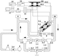 步骤2,打开第一截止阀(2.1)、第二截止阀(2.2),关闭第三截止阀(2.3)、第四截止阀(2.4),启动第一离心泵(1‑1)使管道内的介质循环流动,利用第一离心泵(1‑1)在管道内仅循环输送浓度为0.1vol.%的水性磁流体,启动空气压缩机(4),打开针阀(2.5),向管道内输送压力气体驱动水性磁流体均匀混合,启动空气分离器(6)分离出气体,通过信号发生器(15)激活双极电源(14)向还原线圈组(10)的励磁线圈(10.2)输送电流,还原线圈组(10)与感应线圈组(9)串联,使感应线圈组(9)感应磁场,所述感应线圈组(9)其中一侧的感应线圈(9.1)分别连接到信号放大器(11)和还原线圈组(10)其中一侧的感应线圈(10.1),所述感应线圈组(9)其中另一侧的感应线圈(9.1)也分别连接到信号放大器(11)和还原线圈组(10)其中另一侧的感应线圈(10.1),并且还原线圈组(10)的两侧感应线圈(10.1)均分别连接到信号放大器(11);所述信号放大器(11)连接高通滤波器(12),所述高通滤波器(12)连接模数转换计算机(13);所述还原线圈组(10)其中一侧的感应线圈(10.1)连接到所述感应线圈组(9)的励磁线圈(9.2),通过模数转换计算机(13)读取倾斜管道内的水性磁流体切割磁感线产生感应电动势V(q=0);