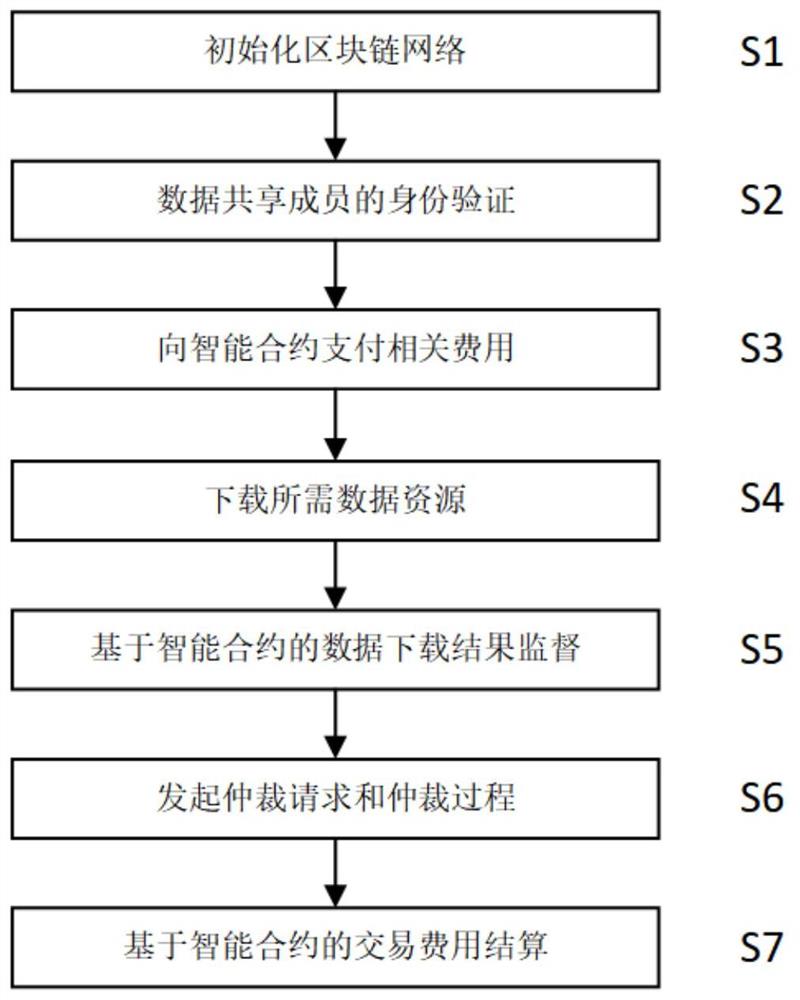7)基于智能合约的费用结算:若数据购买者能成功下载数据且对数据可用性满意,智能合约将直接进行费用结算;若数据购买者不能成功下载数据或者对下载的数据不满意,智能合约将根据仲裁结果自动进行仲裁费用的支付及其他参与交易实体的费用结算。